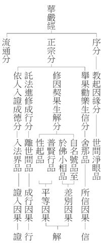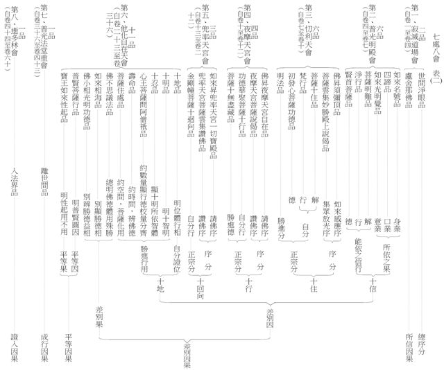 (1)六十華嚴。凡六十卷。東晉佛馱跋陀羅譯。又稱舊華嚴、晉經。收於大正藏第九冊。總成七處,八會,三十四品。華嚴宗將本經三十四品攝為教起因緣分、舉果勸樂生信分、修因契果生解分、託法進修成行分、依人入證成德分等五分,此係就經文而別之;及立所信、差別、平等、成行、證入等五周之因果,此則就義理而區分。如表所示。
