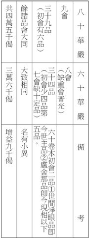 (2)八十華嚴。凡八十卷。唐代實叉難陀譯。又稱新華嚴、唐經。收於大正藏第十冊。總成七處,九會,三十九品。為六十華嚴之異譯。茲將八十華嚴與六十華嚴之異同處,如表所示: