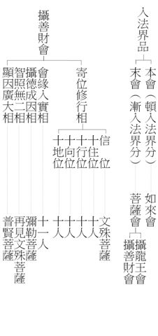 四十華嚴僅有入法界品一品,然此品佔華嚴經四分之一以上,故視之為異譯,茲將其結構組織,如表所示。